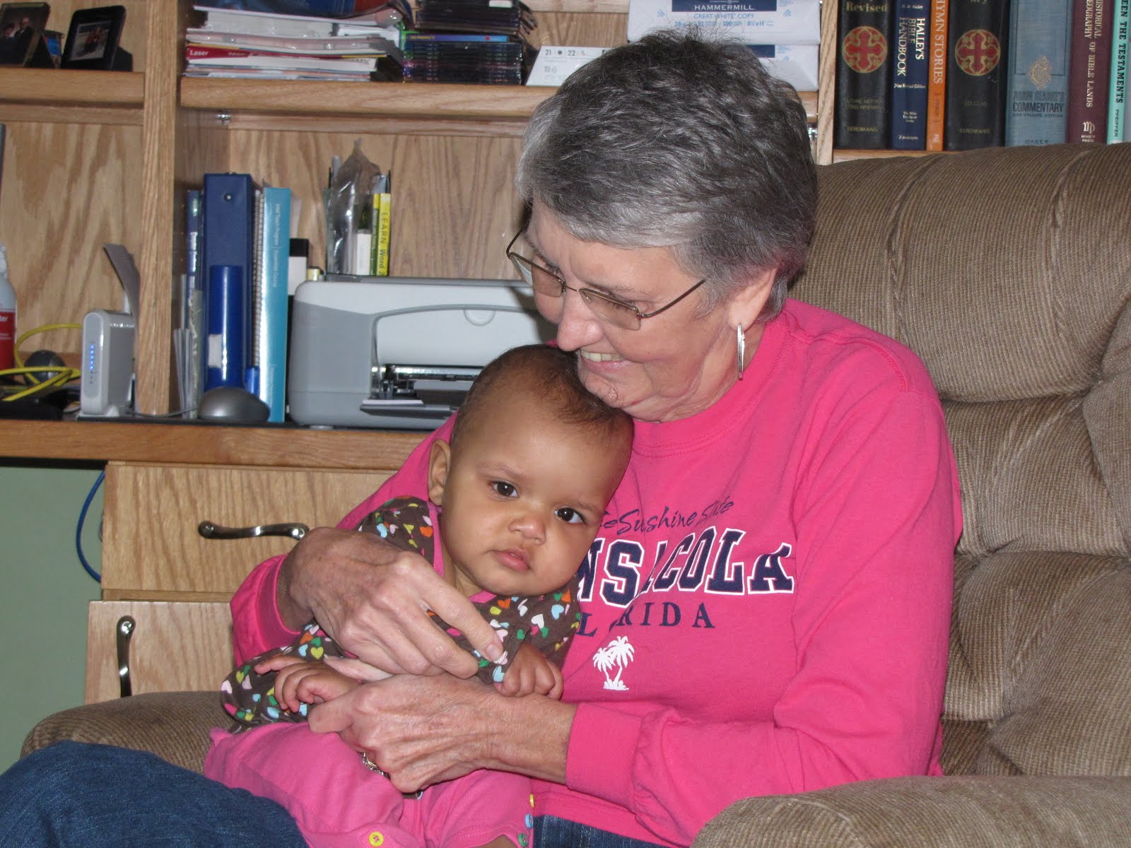 This week was a little boring because we didn't get to do too much. Monday and Tuesday were cold and rainy and then Kitt got an ear infection! We have all been trying to make sure she was feeling better so we could make our trip to South Carolina. We did get together with Emily, Frankie and their mommy but other than that, we did very little. Then on Saturday morning we came to South Carolina. Mommy's cousin, Joan, was getting married. This was our first wedding, well, sort of. Daddy was worried we were going to make noise at the wedding so we stayed on the porch of the reception site and then went to Great Aunt Bonnie's house. We got to meet lots of new relatives these past couple of days which has been fun. In the picture with Garet and Great Aunt Trina, Great Aunt Trina is talking to Granny. We think she was trying to make Granny a little jealous! Speaking of jealous, it seems like David is trying to make Grandpa jealous in showing her sitting in David's lap! We are looking forward to a fun week in a new place with new stores to see and with Thanksgiving to celebrate!